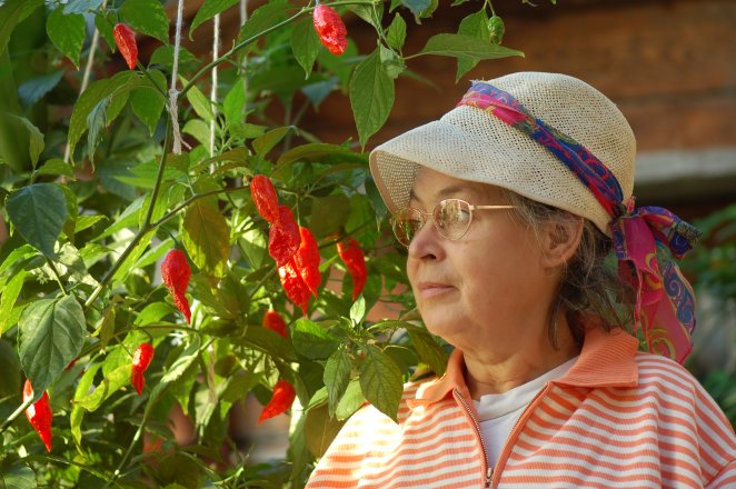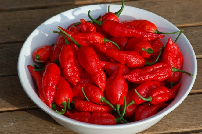 Um das Jahr 2000 kursierte zum ersten Mal das Gerücht, dass in Nordindien der schärfste Paprika der Welt gedeiht. Das rief den damaligen "Rekordhalter" auf den Plan: Frank Garcia, der in den USA die Sorte "Red Savina" gezüchtet hatte, zweifelte einfach an, dass es etwas schärferes geben könne als seine Sorte. Tatsächlich wurden in den folgenden Jahren aus Indien einige Chili-Sorten eingeführt, die zu den Arten Capsicum annuum oder C. frutescens gehörten und die der Superscharfe sein sollten. Messungen zeigten aber, dass sie um mindestens den Faktor 10 daneben lagen. Außerdem war klar, dass der schärfste Paprika der Welt ein Capsicum chinense sein musste. Paprikaschärfe wird in Scoville-Einheiten (Scoville Hotness Units = SHU) gemessen. 1000 SHU bedeuten, dass die Schärfe von 1 Teil Paprika in 1000 Teilen Wasser noch zu schmecken ist. Inzwischen kann der SHU-Wert mit Hilfe chromatographischer Methoden, die unmittelbar die Konzentration der schärfegebenden Substanz Capsaicin ermitteln, auch objektiv gemessen werden. "Normale" scharfe Paprika haben einige 1000 SHU. Sehr scharfe Capsicum annuum und C. frutescens (wie z.B. "Bailey Pequin" und "Tabasco") bringen es auf einige 10.000 SHU. Bei etwa 100.000 SHU setzen die scharfen Sorten von C. chinense (wie verschiedene "Habanero"-Formen, "Jaune de Burkina" oder "Fatalii") ein, die es z.T. auf über 300.000 SHU bringen. Für "Red Savina" war der Wert 570.000 angegeben worden. Das also war der Maßstab für den "schärfsten aller". Schließlich tauchte er in einer Probe, die das Paprikainstitut (CPI) der Universität von New Mexico aus dem Teeanbaugebiet Assam im Nordosten Indiens erhalten hatte, doch noch auf: "Bhut Jolokia" (assamesisch für "Geisterpaprika"), ein Capsicum chinense mit schlanken roten Früchten. Die Sorte wurde zunächst im CPI vermehrt und auf ihre Eignung getestet. Im Jahr 2005 war es dann soweit: Die Sorten "Orange Habanero", "Red Savina" und "Bhut Jolokia" wurden einem umfassenden Vergleichsanbau unterzogen, und es wurde die Schärfe von Früchten gemessen, die in gleicher Weise kultiviert worden waren. Das Ergebnis: "Orange Habanero" mit 357.729 SHU, "Red Savina" mit 248.556 SHU und "Bhut Jolokia" mit 1.001.304 SHU. Erstaunlich war das schlechte Abschneiden des bisherigen Rekordhalters. "Bhut Jolokia" aber wurde als schärfster aller bekannten Paprikas bestätigt. Im Frühjahr 2007 konnte man erstmals "Bhut Jolokia"-Samen aus dem CPI kaufen. Wir haben die Sorte wie unsere übrigen Capsicum chinense kultiviert und damit guten Erfolg gehabt. "Bhut Jolokia" ist allerdings unter unseren Bedingungen langsamwüchsig und empfindlich gegen niedrige Temperaturen im Winter und zu hohe im Sommer. Eine ordentliche Ernte haben wir erst 2008 von überwinterten Pflanzen erhalten. "Bhut Jolokia"-Früchte sind wirklich extrem scharf und zudem extrem aromatisch. Es sind praktisch 3 "Habanero" oder 3 "Fatalii" in einer Frucht. Dafür kann man von den letzteren Sorten mit dem gleichen Aufwand vielleicht eine 3 mal so große Ernte erzielen. Von daher muss man also den "Geisterpaprika" nicht haben. Wie vieles aus unserem Angebot ist er etwas für solche Gartenfreunde, die das Besondere suchen. Sie finden ihn unter der Nr. 2109B.