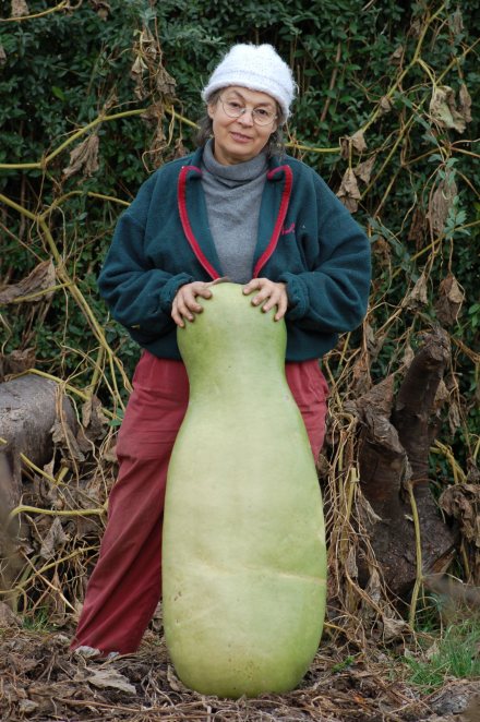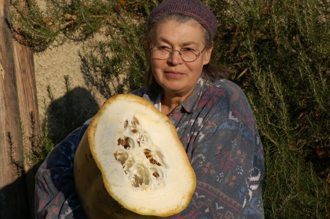 Monika Gehlsen mit einer unserer Neuheiten 2007 - dem Speise-Flaschenkürbis "Zucca Melon".